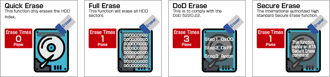 Quick Erase, Full Erase, DoD Erase, and Secure Erase
