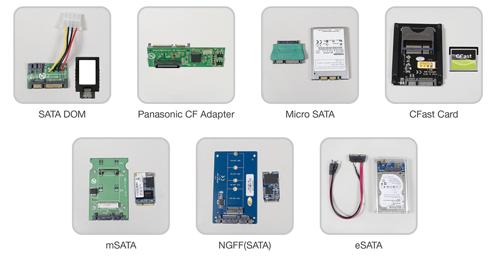 Via Adaptor: 2.5", 3.5” IDE HDD, mSATA SSD, micro SATA, eSATA, ZIF, iVDR interfaces are compatible.