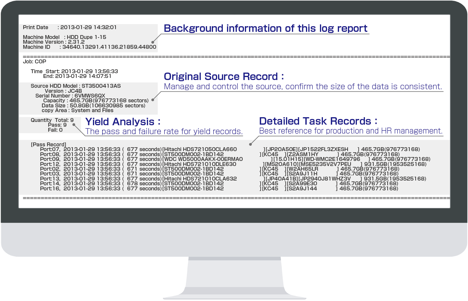 U-Reach HDD/SSD duplicators has an unique mechanism to prevent alteration of its Event Log Report. It records the operation results and other information of each devices completely. It is an important asset for production management and analysis.