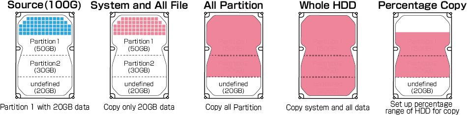 Quick Copy, All Partitions Copy, Whole HDD Copy, and Percentage Copy