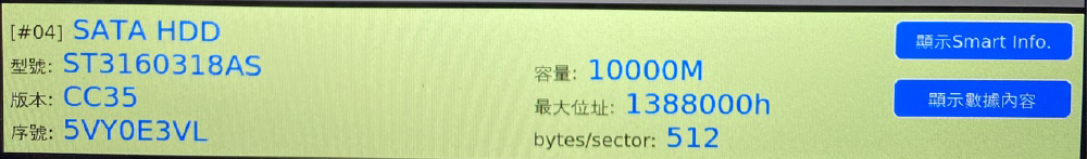 從「顯示裝置訊息」中,可顯示硬碟插槽上,每一顆硬碟的的訊息,包含型號、版本、序號、容量、Smart Info以及數據內容。