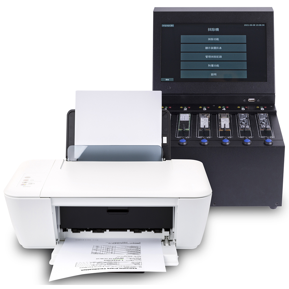GE系列硬碟資料抹除機可連接印表機直接列印抹除報告,報告內容包含裝置訊息、抹除功能時間以及結果、硬碟SMART Info以及抹除機的訊息,或者透過前方的USB口輸出抹除報告電子檔。