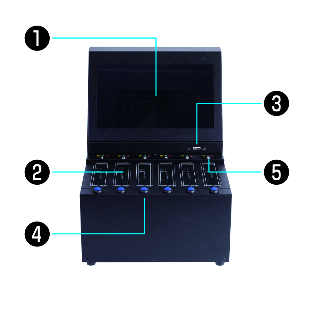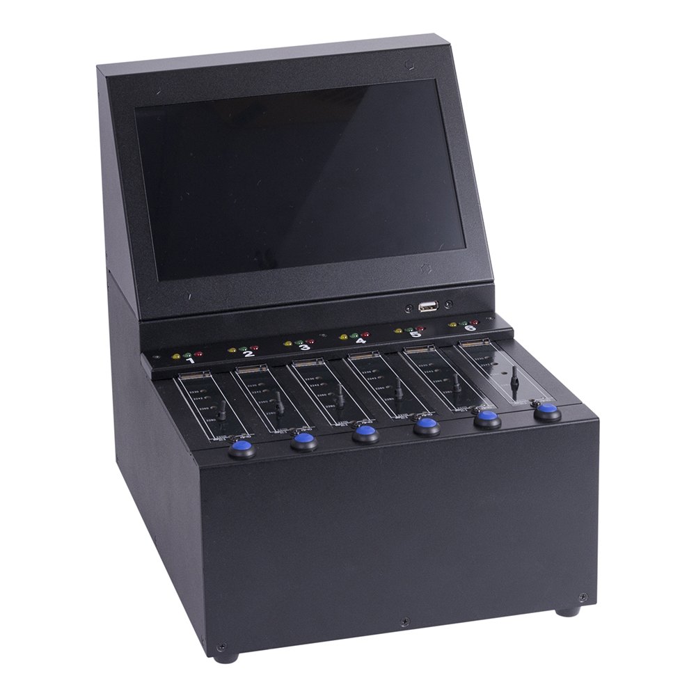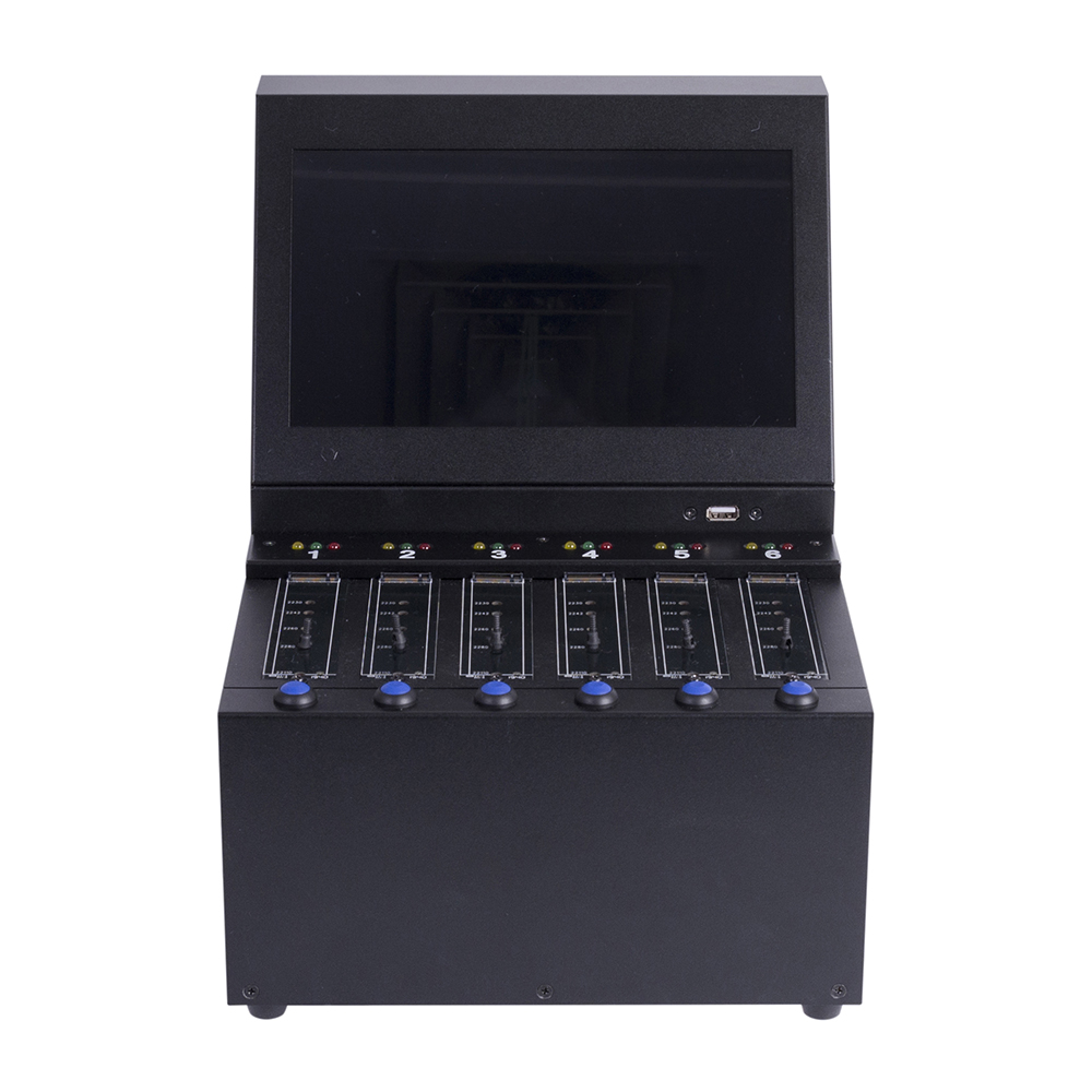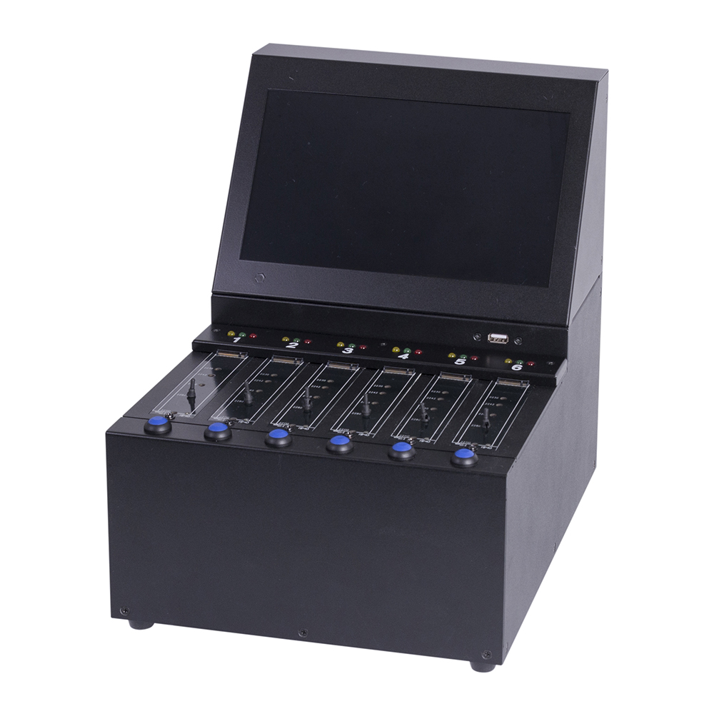 每分鐘12GB(190MB/s)高速資料抹除,一次抹除6顆M.2 SSD,抹除機M.2介面可支持M.2 SATA (NGFF) / NVMe訊號的SSD,抹除之前不需區分訊號,插上之後即可進行抹除。