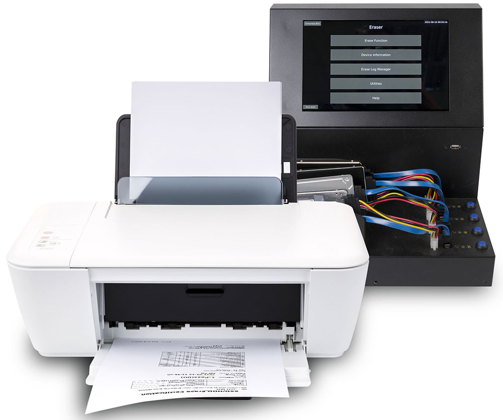 GT系列硬碟資料抹除機可連接印表機直接列印抹除報告,報告內容包含裝置訊息、抹除功能時間以及結果、硬碟SMART Info以及抹除機的訊息,或者透過前方的USB口輸出抹除報告電子檔。