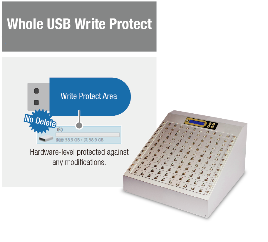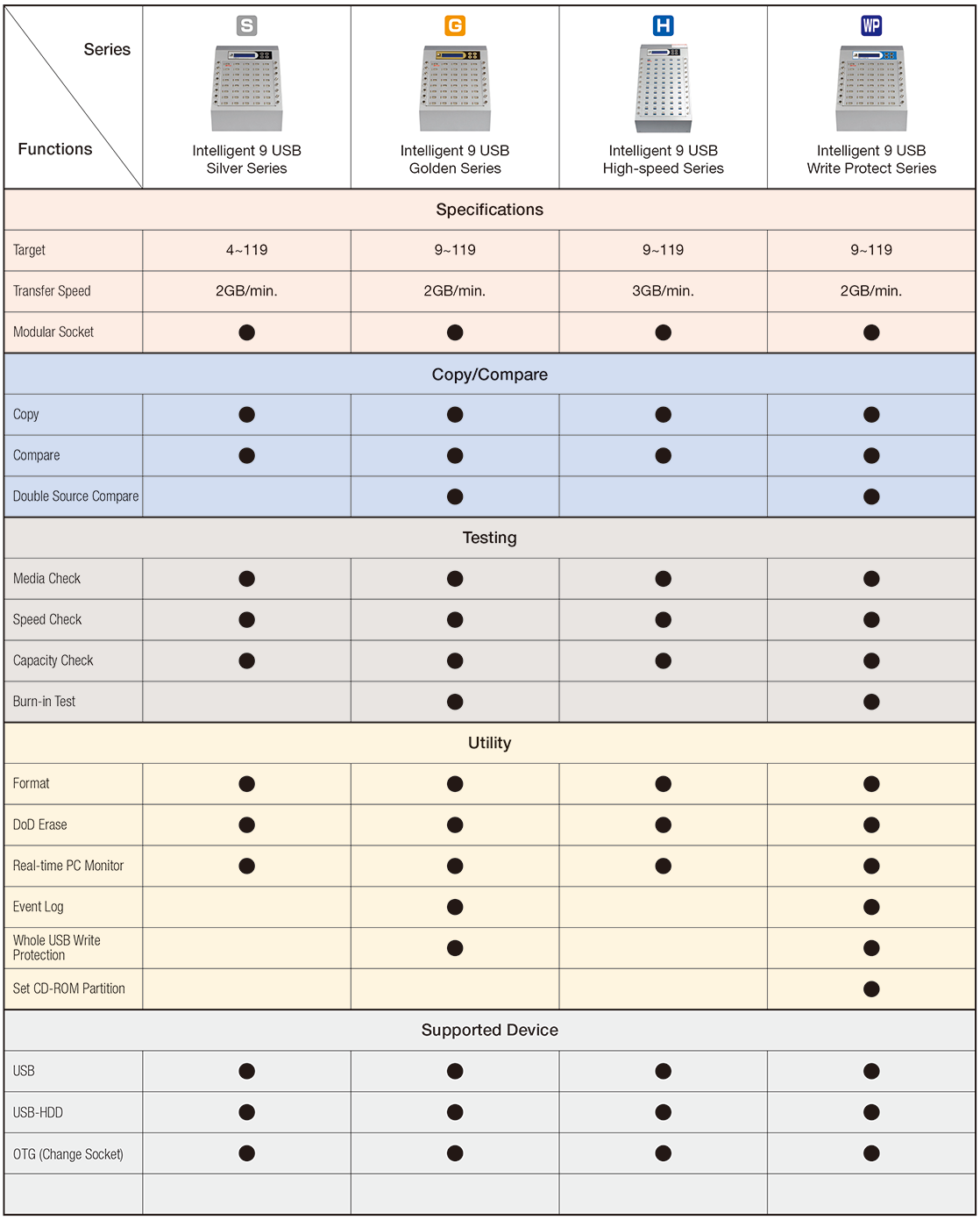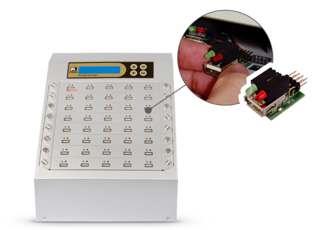 The most cutting edge in duplication technology, our Intelligent 9 series USB drive duplicator is professional, standalone and efficient. It can duplicate a full range of USB drives starting from 9 and up to 59 targets. Speed and flexibility are key factors in satisfying customer needs. Its effortless use means a PC or other software are not required; the USB drive duplicator provides a reliable, worry-free copy environment for users, without the risk of virus corruption. This USB duplicator series is integrated with a high-speed compare function to ensure data copies with 100% accuracy. It also boasts quick format capabilities. These features greatly help increase efficiency and production productivity.