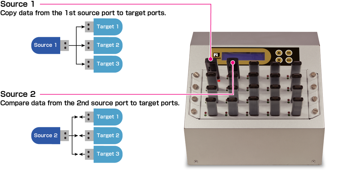 Double source comparison can eliminate the chance of a duplication error caused by a worn source. Use the first port as a copying source and use the second port as a compare source. It can guarantee the highest reliability and 100% correctness of the duplication result.